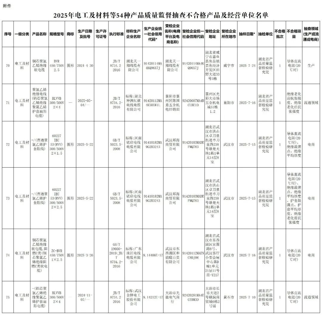 湖北省发布电线电缆产品质量监督抽查结果,6批次不合格