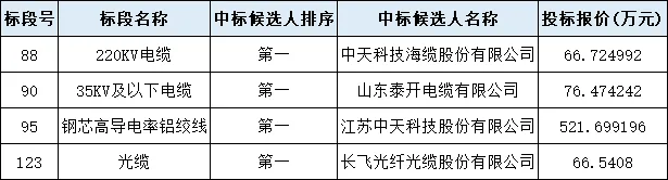 内蒙古电力集团电子商务平台发布了《内蒙古电力(集团)2025年固定资产投资项目基建工程应急六批设备材料招标采购中标候选人公示》,该项目采购包括220kV电缆、35kV及以下电缆、钢芯高导电率铝绞线、光缆等物资,中标线缆企业详情见下表。