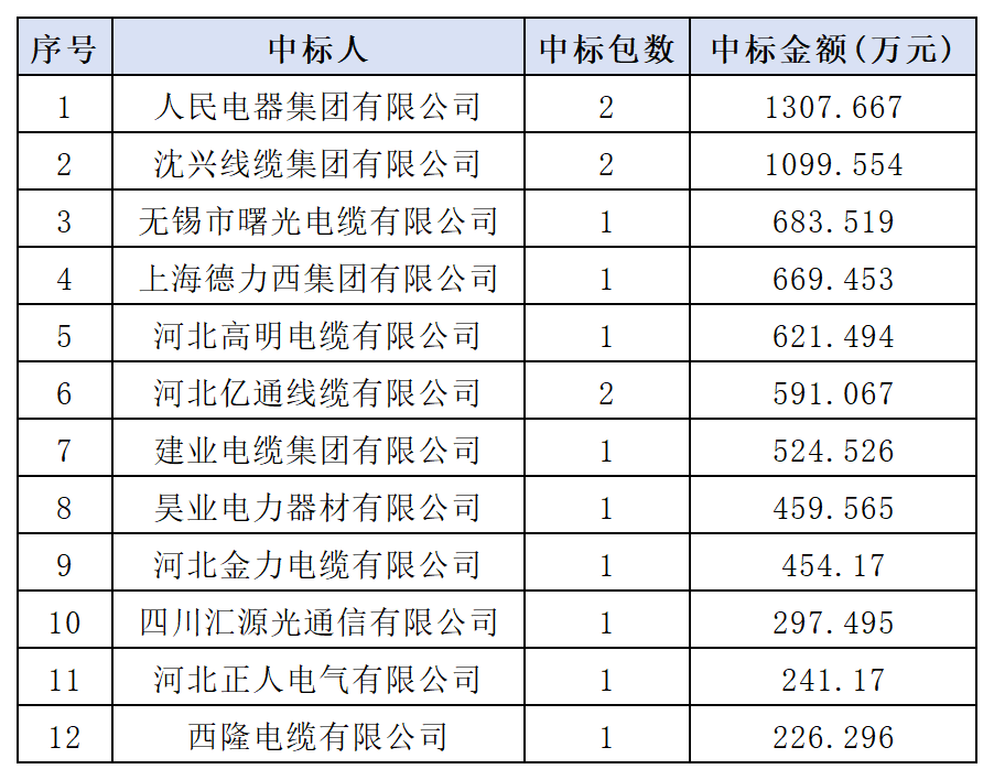 据统计,共有12家线缆企业中标,累计中标金额超7000万元,中标企业见榜单。
