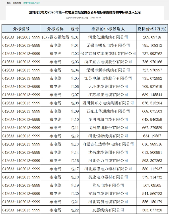 国网电子商务平台发布了《国网河北电力2026年第一次物资类框架协议公开招标采购推荐的中标候选人公示》,该项目采购包括10kV钢芯铝绞线、布电线等物资,中标缆企情况见下表。
