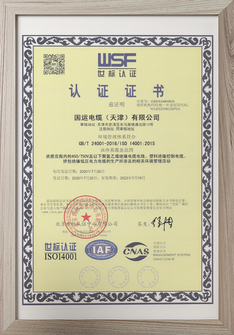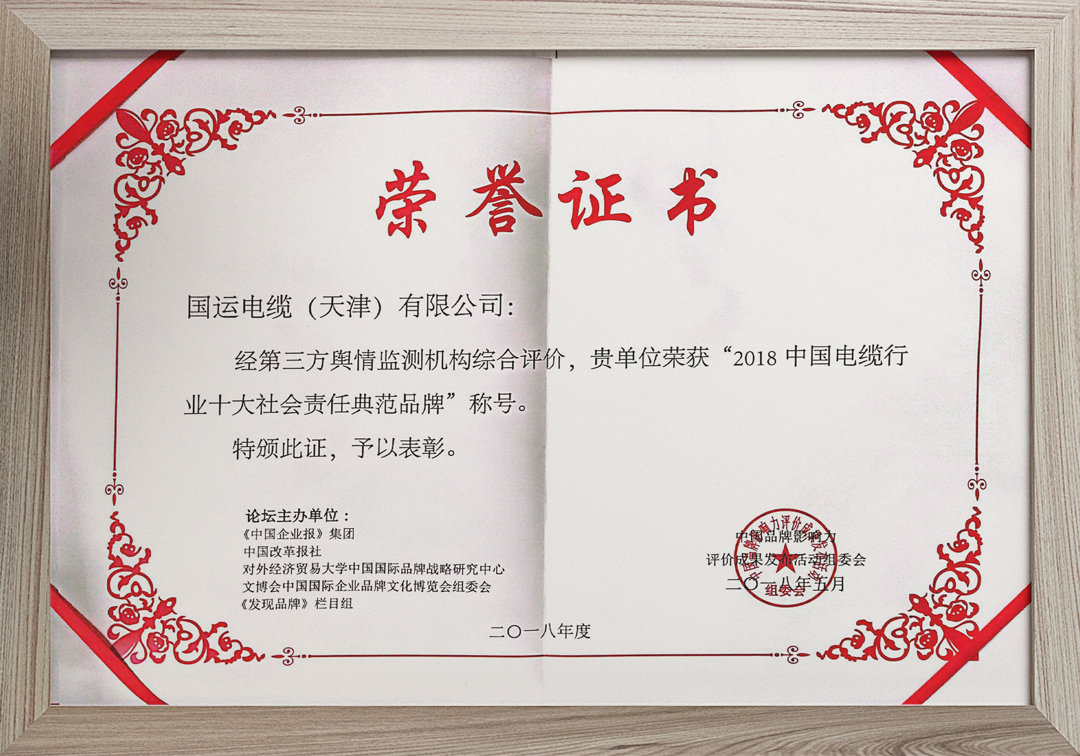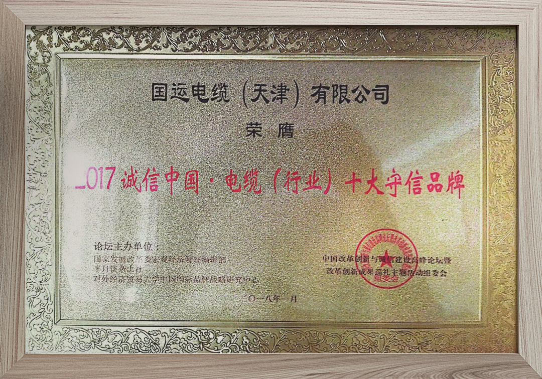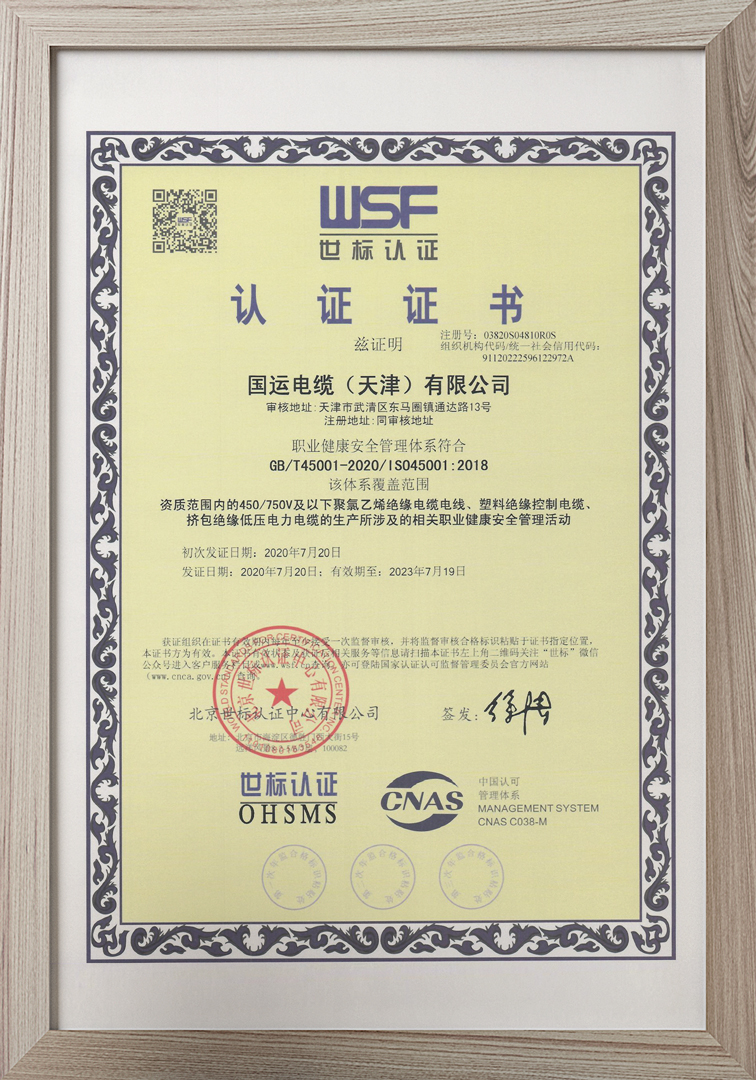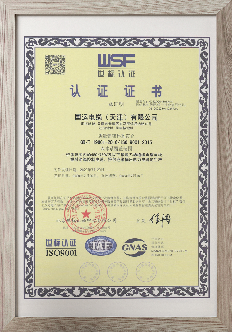 “质量铸就品牌,诚信通商天下”,公司信守该宗旨实施严格、科学、高效的管理体系,获得质量管理体系认证、环境管理体系认证、职业健康安全管理体系认证、中国国家强制性产品认证、全国工业产品生产许可证,并创出了名牌产品“国运”牌电线电缆。