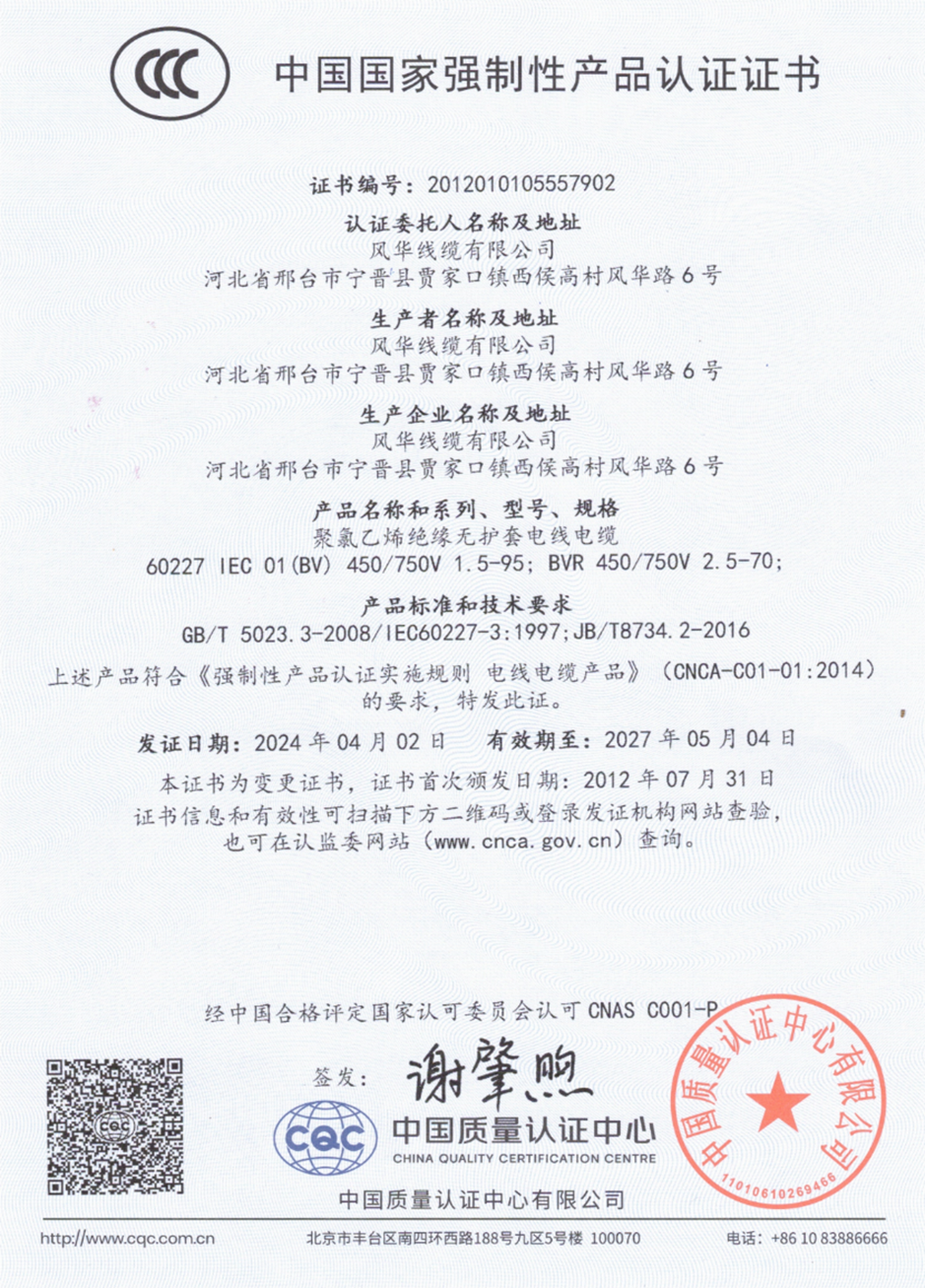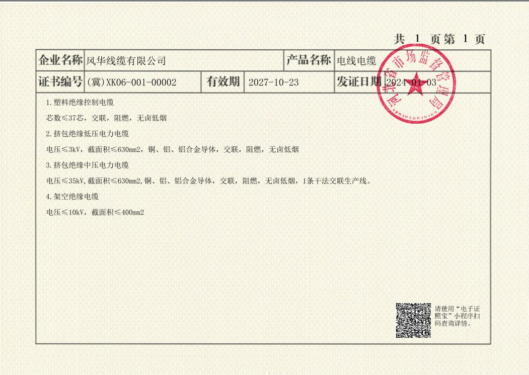 风华线缆有限公司成立于2003年,注册地位于邢台市,主营业务为电线电缆的研发与生产。 公司产品涵盖高压电力电缆、低压电力电缆等十余种类别,广泛应用于电力、石油、建筑等领域。 该企业参与北京鸟巢、南水北调等国家重点工程建设,服务范围覆盖城市基础设施与大型工业项目。 截至2024年,公司累计获得20项专利,涉及光缆耐腐蚀技术、电缆生产设备改进等领域。