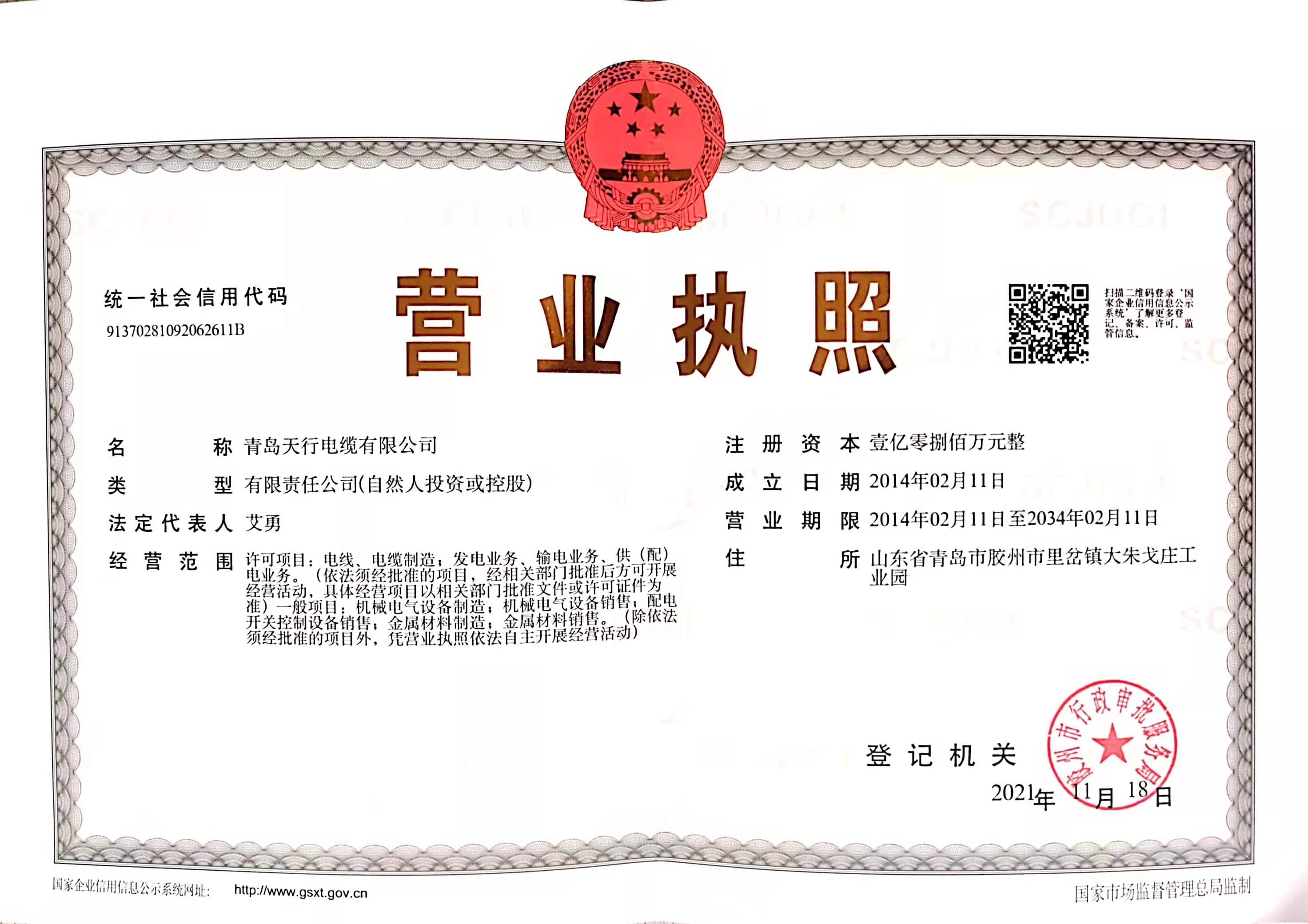 青岛天行电缆有限公司位于山东省青岛胶州市辖区,是山东省电线电缆的专业制造商,公司厂区占地面积5万平方米,拥有国内先进的线缆生产、检测设备150余台套,生产工艺先进、检测手段齐全、产品质量稳定可靠。公司主要生产电线、裸电线、电力电缆、交联电缆、控制电缆、光伏电缆、铝合金电缆、计算机电缆、光伏电缆、同轴电缆、高寿命电缆、数据电缆、低烟无卤电缆、阻燃耐火系列电线电缆等,年生产能力10亿元。公司坚持高起点、严要求,始终按照国家法律法规和强制性产品的要求进行生产,建立了完善的企业质量监督管理体系,确保公司产品质量得到可靠的保证。