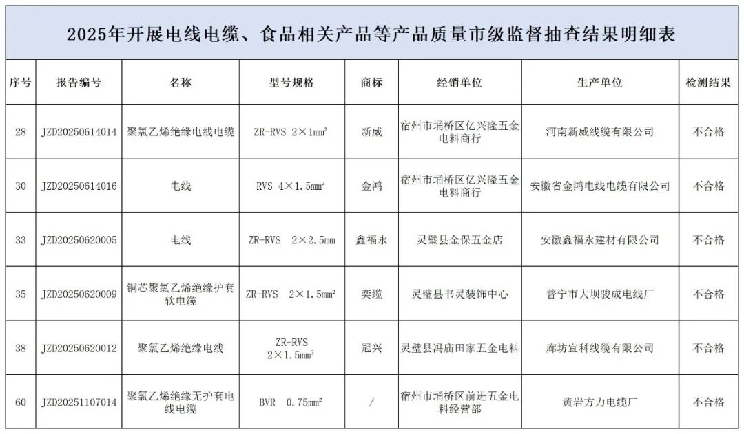 近日,宿州市市市场监督管理局根据《中华人民共和国产品质量法》《产品质量监督抽查管理暂行办法》等有关规定,于2025年开展电线电缆、食品相关产品等产品质量市级监督抽查104批次,其中,电线电缆共抽查61批次,不合格6批次。详情见下表。