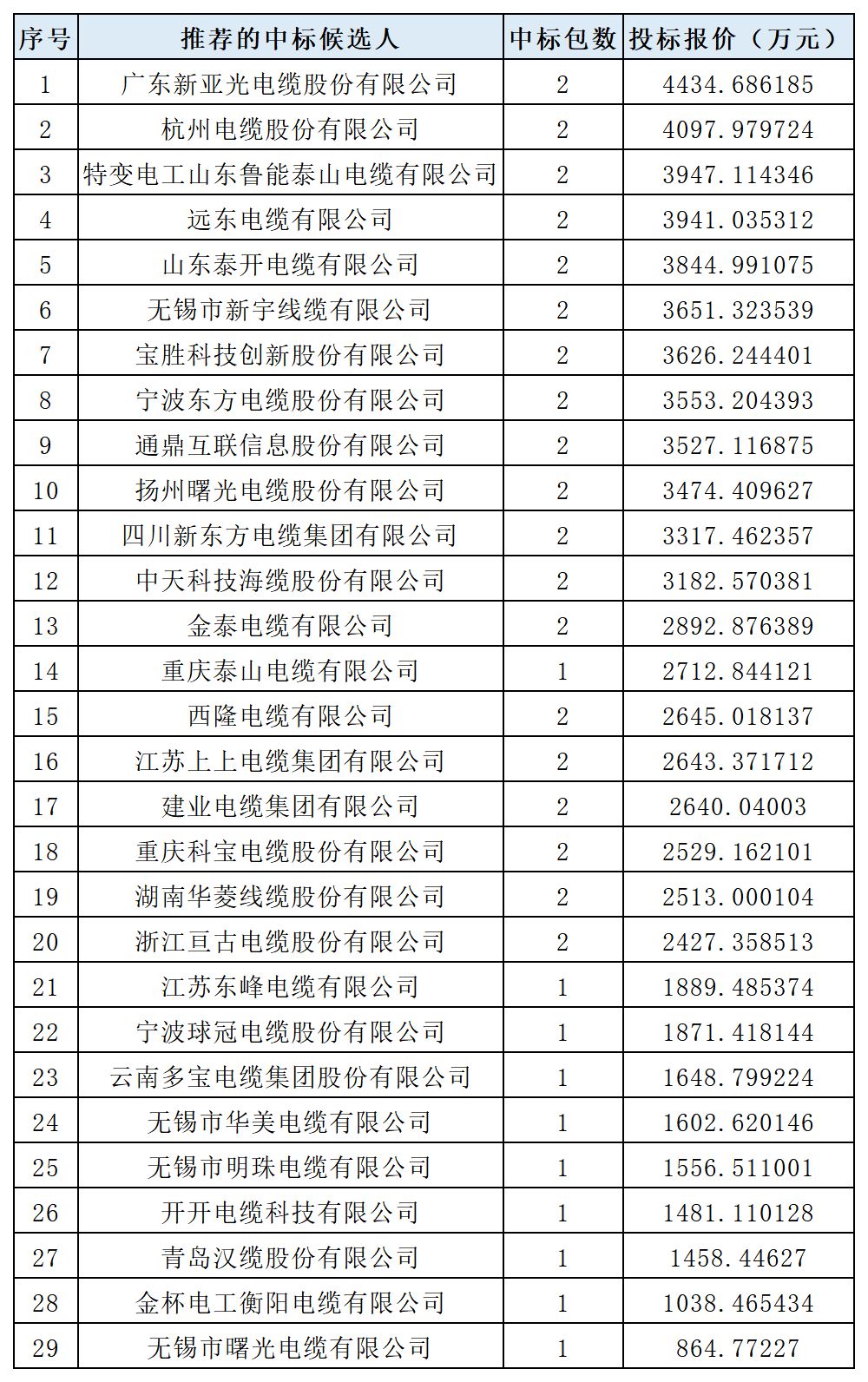其中,中标前二十名企业为:广东新亚光电缆股份有限公司、杭州电缆股份有限公司、特变电工山东鲁能泰山电缆有限公司、远东电缆有限公司、山东泰开电缆有限公司、无锡市新宇线缆有限公司、宝胜科技创新股份有限公司、宁波东方电缆股份有限公司、通鼎互联信息股份有限公司、扬州曙光电缆股份有限公司、四川新东方电缆集团有限公司、中天科技海缆股份有限公司、金泰电缆有限公司、重庆泰山电缆有限公司、西隆电缆有限公司、江苏上上电缆集团有限公司、建业电缆集团有限公司、重庆科宝电缆股份有限公司、湖南华菱线缆股份有限公司、浙江亘古电缆股份有限公司,更多中标企业见榜单。