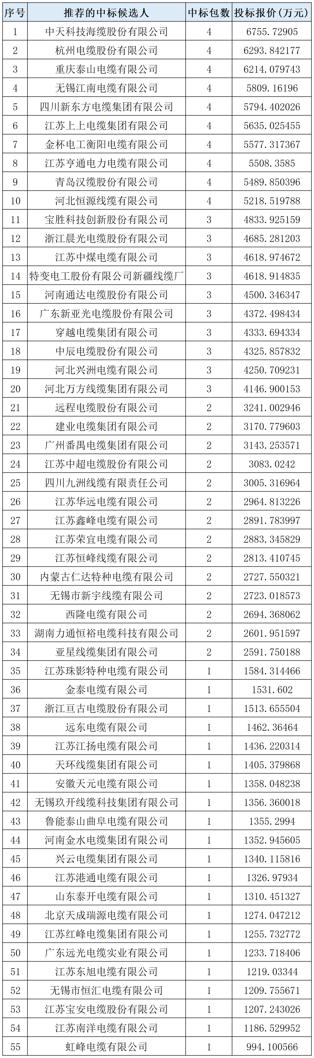其中,中标前二十名企业为:中天科技海缆股份有限公司、杭州电缆股份有限公司、重庆泰山电缆有限公司、无锡江南电缆有限公司、四川新东方电缆集团有限公司、江苏上上电缆集团有限公司、金杯电工衡阳电缆有限公司、江苏亨通电力电缆有限公司、青岛汉缆股份有限公司、河北恒源线缆有限公司、宝胜科技创新股份有限公司、浙江晨光电缆股份有限公司、江苏中煤电缆有限公司、特变电工股份有限公司新疆线缆厂、河南通达电缆股份有限公司、广东新亚光电缆股份有限公司、穿越电缆集团有限公司、中辰电缆股份有限公司、河北兴洲电缆有限公司、河北万方线缆集团有限公司,更多中标企业见榜单。
